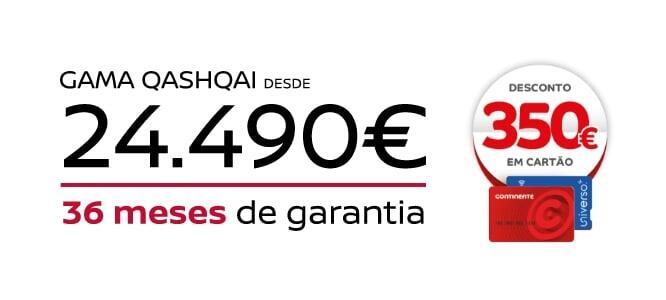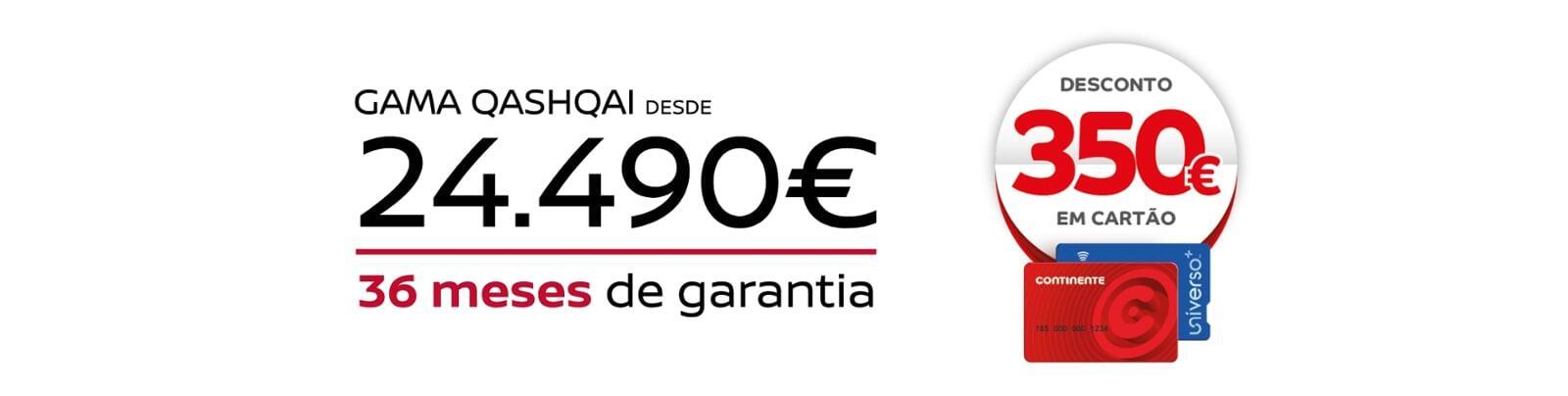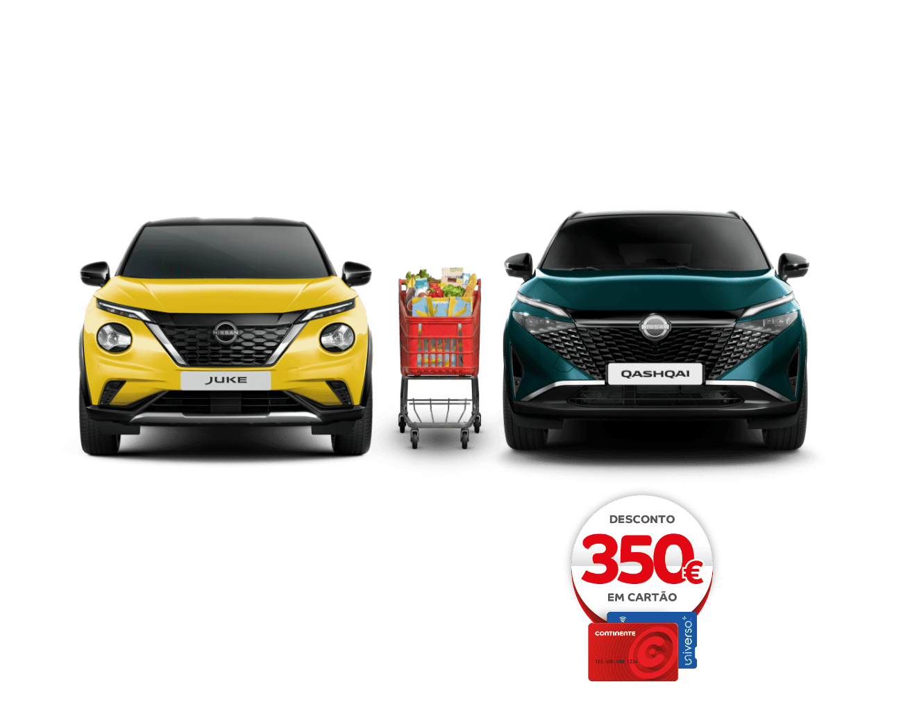 *Exemplo para Nissan QASHQAI DIG-T E6D (140 CV) mHEV Acenta, válido até 31/05/2026 para clientes particulares e ENIS em Portugal Continental. Os 350€ em Cartão Continente são válidos para todas as viaturas abrangidas pelo programa Nissan Intelligent Choice. A informação disponibilizada não é vinculativa. Campanha limitada ao stock existente. Visual não contratual. Consumo combinado: 6,3l/100 km. Emissões de CO2: 142g/km