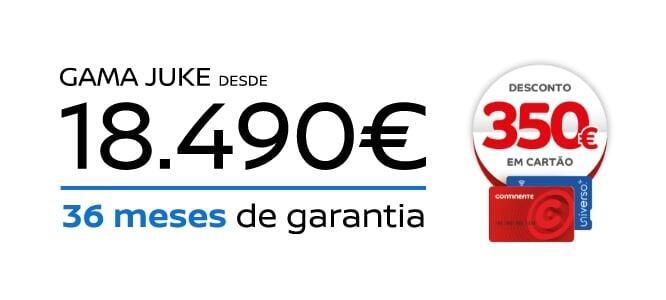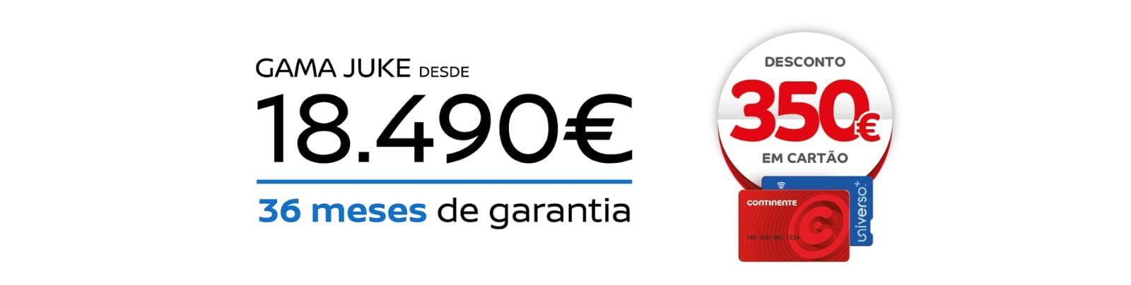 *Exemplo para Nissan JUKE DIG-T (114 CV) Acenta MT (2024), válido até 31/05/2026 para clientes particulares e ENIS em Portugal Continental. Os 350€ em Cartão Continente são válidos para todas as viaturas abrangidas pelo programa Nissan Intelligent Choice. A informação disponibilizada não é vinculativa. Campanha limitada ao stock existente. Visual não contratual. Consumo combinado: 5,8l/100 km. Emissões de CO2: 133g/km.