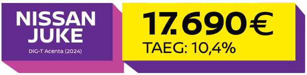 *Crédito Automóvel c/ reserva de propriedade válido até 31/03/2026 para o JUKE DIG-T (114 CV) Acenta MT (2024), limitado ao stock existente nos concessionários aderentes. Inclui pintura metalizada, despesas de transporte e documentação. PVP: 17.690€ (Inclui desconto associado à campanha de financiamento Nissan). Entrada inicial: 3.953€ + 120 mensalidades: 169€. Montante financiado: 13.737€. Inclui comissão de abertura: 650,00€. TAN 8,0%. TAEG 10,4%. MTIC: 21,204,27€. IS à taxa legal em vigor. PVP sem financiamento: 18.990,00€. Crédito sujeito a aprovação Cetelem, marca BNPP PF, S.A., Sucursal Portugal (registo BdP nº 848). Informe-se no 21 721 90 00 (dias úteis, 9-20h), chamada para a rede fixa nacional. A Nissan Portugal é intermediária de crédito a título acessório e atua sem caráter de exclusividade registada no BdP c/ o n.º 7524. Imagem não contratual. Consumo combinado: 5,8l/100 km. Emissões de CO2: 133g/km.